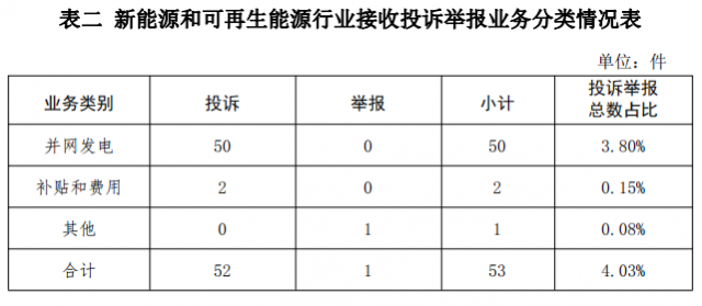 新能源和可再生能源行業(yè)排在第二位,數(shù)量為53件、占投訴舉報總數(shù)的4.03%,主要集中在并網發(fā)電、補貼和費用等方面。
