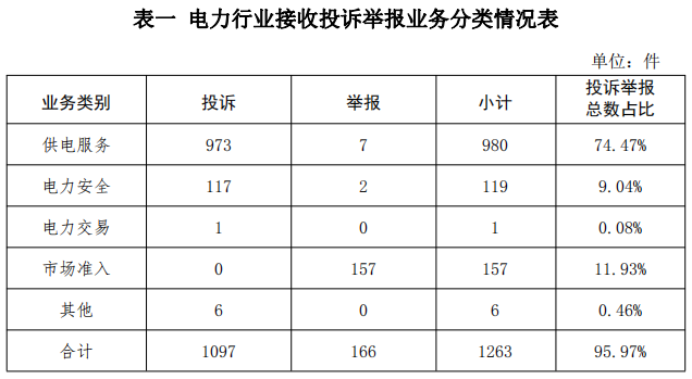 電力行業(yè)排在首位,數(shù)量為1263件、占投訴舉報總數(shù)的95.97%,主要集中在供電服務、市場準入、電力安全等方面。