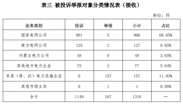 供電企業(yè)1158件、占投訴舉報總數(shù)的87.99%,其中國家電網公司906件、占投訴舉報總數(shù)的68.85%,南方電網公司127件、占投訴舉報總數(shù)的9.65%,內蒙古電力公司48件、占投訴舉報總數(shù)的3.65%,其他地方電力企業(yè)77件、占投訴舉報總數(shù)的5.84%;承裝(修、試)電力設施企業(yè)157件、占投訴舉報總數(shù)的11.93%;其他市場主體1件、占投訴舉報總數(shù)的0.08%。