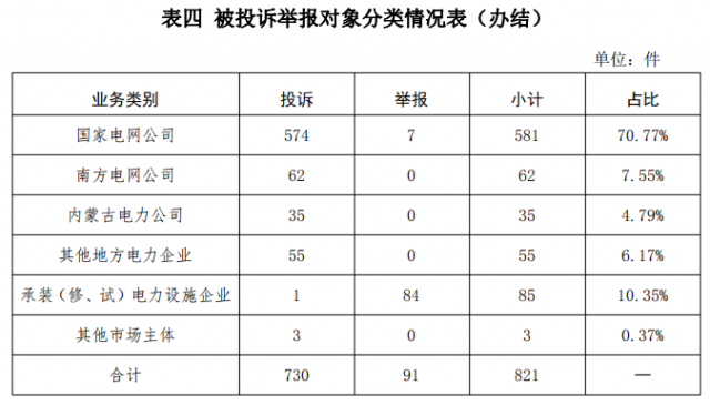 從被投訴舉報對象看,供電企業(yè)733件、占投訴舉報總數(shù)的89.28%,其中國家電網公司581件、占比70.77%,南方電網公司62件、占比7.55%,內蒙古電力公司35件、占比3.65%,其他地方電力企業(yè)55件、占比6.17%;承裝(修、試)電力設施企業(yè)85件、占比10.35%;其他市場主體3件、占比0.37%。