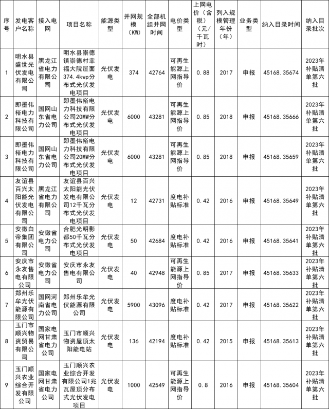 8月31日,國(guó)家電網(wǎng)發(fā)布《關(guān)于公布2023年第六批可再生能源發(fā)電補(bǔ)貼項(xiàng)目清單的報(bào)告》,此次納入2023年第六批可再生能源發(fā)電補(bǔ)貼清單的項(xiàng)目共11個(gè),核準(zhǔn)/備案容量83.4MW。其中:集中式發(fā)電項(xiàng)目2個(gè)、核準(zhǔn)/備案容量50MW,分布式發(fā)電項(xiàng)目9個(gè)、核準(zhǔn)/備案容量33.4MW。