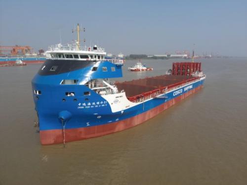 2023年10月16日,揚(yáng)州中遠(yuǎn)海運(yùn)重工有限公司新建全球首制700TEU純電池動力集裝箱船“中遠(yuǎn)海運(yùn)綠水01”輪,由揚(yáng)州中遠(yuǎn)海運(yùn)重工有限公司碼頭開航至儀征捷水道進(jìn)行航行操作試驗(yàn),正式開啟本次試航之旅。