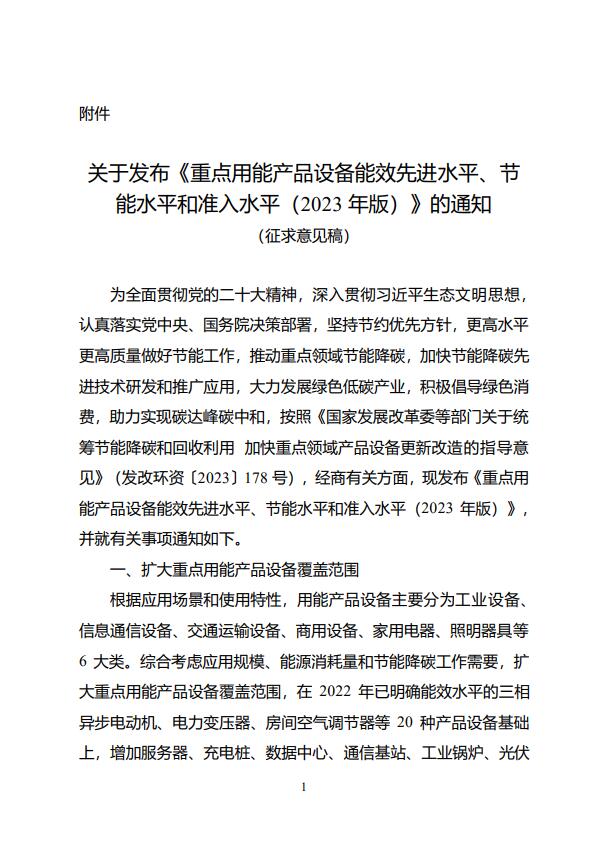 附件:關(guān)于發(fā)布《重點(diǎn)用能產(chǎn)品設(shè)備能效先進(jìn)水平、節(jié)能水平和準(zhǔn)入水平(2023年版)》的通知(征求意見稿)