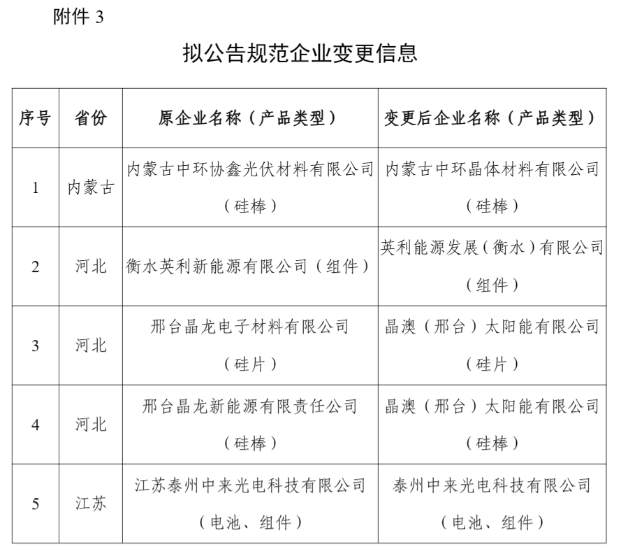 京瓷(天津)太陽能有限公司等14家已公告企業(yè),因不能保持規(guī)范條件要求,擬撤銷其規(guī)范企業(yè)資格(見附件2);內(nèi)蒙古中環(huán)協(xié)鑫光伏材料有限公司等5家企業(yè)名稱發(fā)生變更,擬更新有關(guān)公告信息(詳見附件3),以上信息一并予以公示。