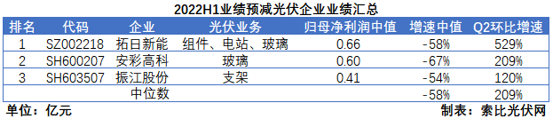 業(yè)績(jī)預(yù)減企業(yè)中,主要以光伏玻璃和光伏支架企業(yè)為主,業(yè)績(jī)降幅中值達(dá)到58%。其中,光伏玻璃企業(yè)主要受到去年一季度光伏玻璃價(jià)格處于高位的影響。PV Infolink數(shù)據(jù)顯示,2022年上半年2.0鍍膜玻璃平均價(jià)格為20.61元/平方米,較去年同期的26.62元/平方米下降23%。不過(guò),從二季度的環(huán)比增速來(lái)看,3家企業(yè)的邊際改善較為顯著,中值達(dá)到209%,下半年的經(jīng)營(yíng)業(yè)績(jī)有望持續(xù)提升。