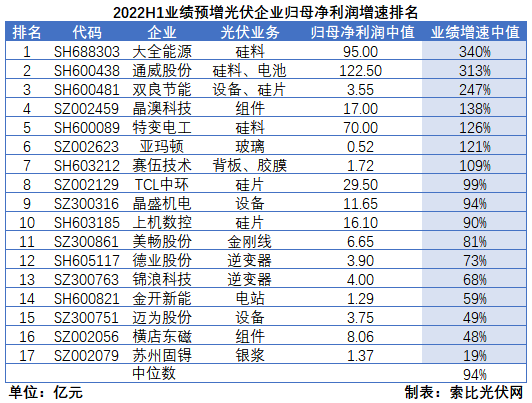 截至7月15日,兩市共有29家光伏企業(yè)發(fā)布2022年半年度業(yè)績(jī)預(yù)告。其中,預(yù)增企業(yè)17家,扭虧企業(yè)5家,預(yù)減企業(yè)3家,預(yù)虧企業(yè)4家。硅料、硅片以及設(shè)備企業(yè)業(yè)績(jī)?cè)鏊倬忧埃芄枇蟽r(jià)格暴漲影響較大的專業(yè)化電池及組件企業(yè)經(jīng)營(yíng)業(yè)績(jī)則出現(xiàn)顯著分化。