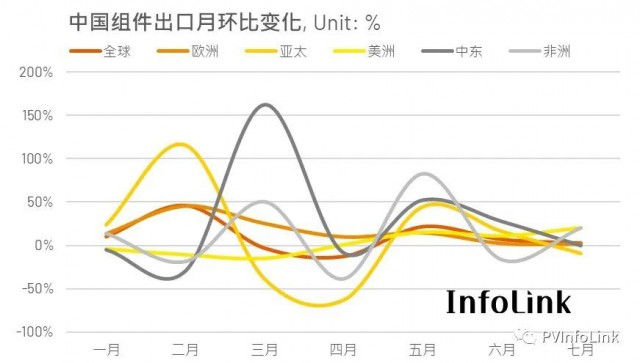 中國(guó)組件出口持續(xù)成長(zhǎng),若各月和去年同期比較,同比成長(zhǎng)都有接近甚至超過(guò)一倍以上的漲幅,但是觀察每月的環(huán)比成長(zhǎng)可以發(fā)現(xiàn)中國(guó)組件的出口成長(zhǎng)可能已開(kāi)始趨緩。從五月開(kāi)始,每月的出口環(huán)比成長(zhǎng)逐漸萎縮,七月的環(huán)比成長(zhǎng)剩下3%,代表中國(guó)的組件單月出口量已接近今年高峰值。