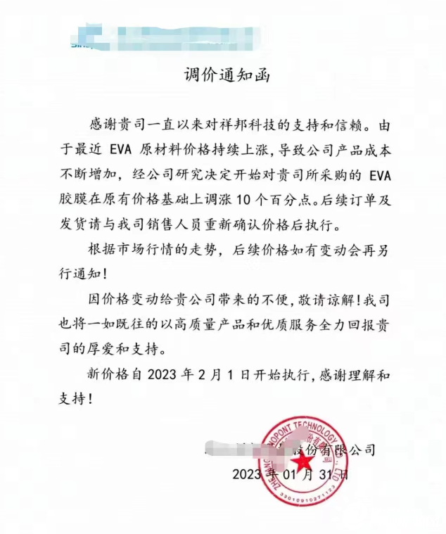 感謝貴司一直以來對(duì)祥邦科技的支持和信賴。由于最近 EVA 原材料價(jià)格持續(xù)上漲,導(dǎo)致公司產(chǎn)品成本不斷增加,經(jīng)公司研究決定開始對(duì)貴司所采購的 EVA膠膜在原有價(jià)格基礎(chǔ)上調(diào)漲 10 個(gè)百分點(diǎn)。后續(xù)訂單及發(fā)貨請與我司銷售人員重新確認(rèn)價(jià)格后執(zhí)行。