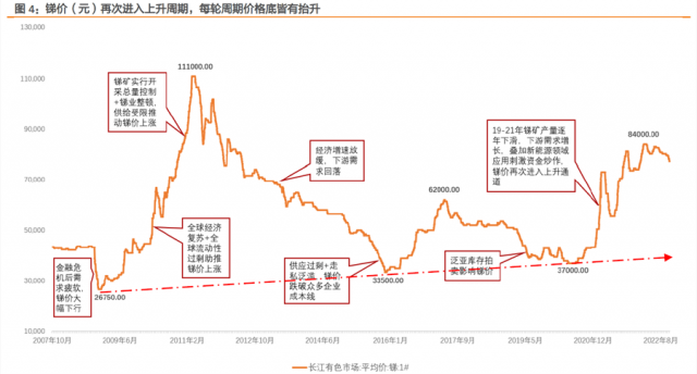 中郵證券還提到,銻可能是2023年有色最亮眼的品種,銻價有望進入強力上漲通道,目前8萬/噸,歷史高點是2011年的12萬,有望創(chuàng)新高。