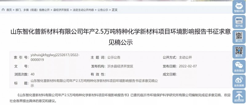 據(jù)悉,山東智化普新材料有限公司年產(chǎn)2.5萬噸特種化學新材料項目目前正在進行環(huán)評。