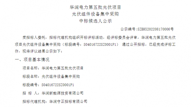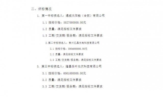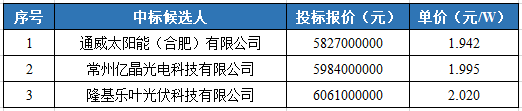 8月17日,華潤電力第五批光伏項目光伏組件設備集中采購中標候選人公示。通威太陽能、億晶光電、隆基樂葉3家企業(yè)分列前三中標候選人,具體如下表所示。
