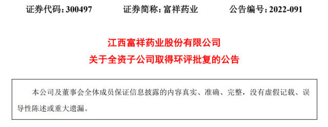10月21日,江西富祥藥業(yè)股份有限公司發(fā)布公告,近日,公司全資子公司江西如益科技發(fā)展有限公司取得宜春市生態(tài)環(huán)境局下發(fā)的《關于江西如益科技發(fā)展有限公司搬遷項目環(huán)境影響報告書的批復》(宜環(huán)環(huán)評[2022]90號)。