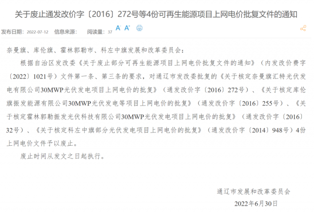 此前,太極實業(yè)(600667)8月4日晚間公告,公司關注到內蒙古發(fā)改委官網刊登的《關于廢止部分可再生能源項目上網電價批復文件的通知》,涉及子公司五個集中式光伏電站;所涉電站將不再享受電費補貼,公司將對所涉電站評估后計提固定資產減值準備,初步測算固定資產減值金額為3.28億元左右。該項固定資產減值預計將減少公司2022年上半年凈利潤3.28億元左右,占最近一期經審計凈利潤的36.12%。同時,本次電價批復廢止將導致所涉電站電價補貼被取消,經初步測算,預計減少公司2022年下半年光伏發(fā)電業(yè)務收入4906萬元左右,減少公司2022年下半年凈利潤4170萬元左右。