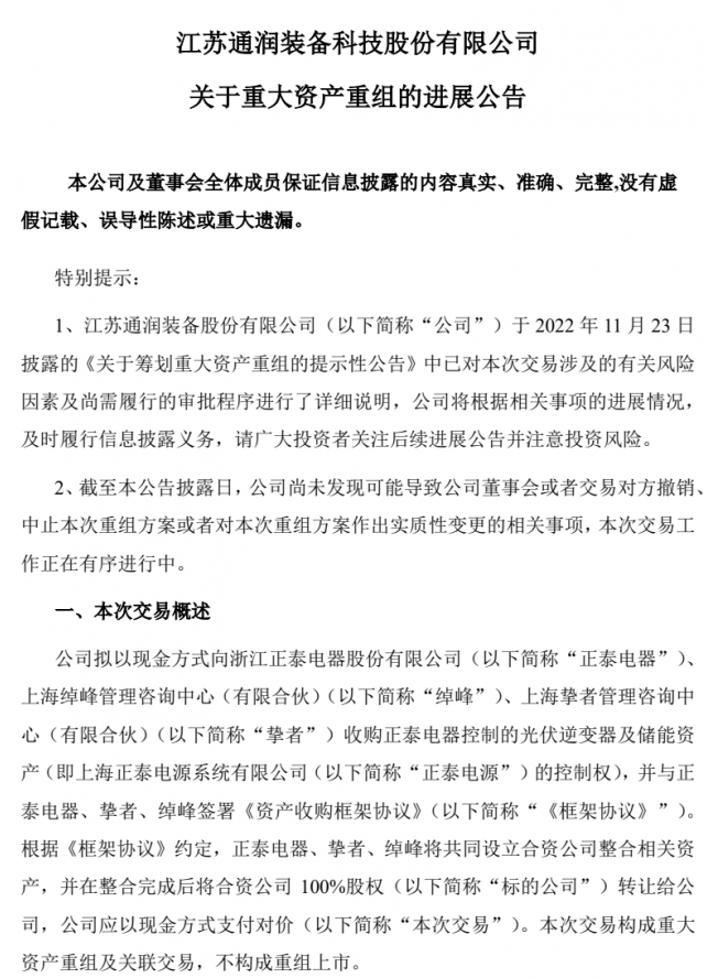 2022年11月23日,公司按照《深圳證券交易所上市公司自律監(jiān)管指引第8號—重大資產(chǎn)重組》規(guī)則要求披露了《江蘇通潤裝備股份有限公司關(guān)于籌劃重大資產(chǎn)重組的提示性公告》。