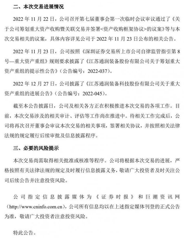 2022年12月27日,公司披露了《江蘇通潤裝備科技股份有限公司關(guān)于重大資產(chǎn)重組的進(jìn)展公告》。截至本公告披露日,公司及相關(guān)各方正在積極推進(jìn)本次交易的各項(xiàng)工作。目前,本次交易涉及的相關(guān)審計(jì)、評估等工作尚在推進(jìn)中。待相關(guān)工作完成后,公司將再次召開董事會(huì)審議本次交易的相關(guān)事項(xiàng),簽署相關(guān)協(xié)議,并按照相關(guān)法律法規(guī)的規(guī)定履行后續(xù)審批及信息披露程序。