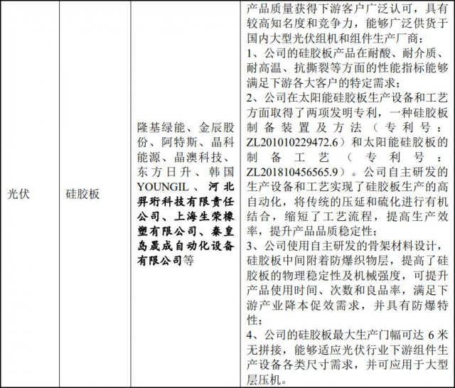 目前,公司太陽能硅膠板產(chǎn)品的下游客戶包括隆基綠能、阿特斯、晶科能源、晶澳科技、金辰股份、協(xié)鑫集成等光伏組件廠商。