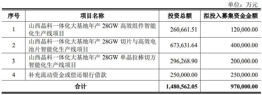 晶科能源向特定對(duì)象發(fā)行股票募集資金總額不超過(guò)970,000.00萬(wàn)元(含本數(shù)),扣除相關(guān)發(fā)行費(fèi)用后的募集資金凈額,擬用于山西晶科一體化大基地年產(chǎn)28GW高效組件智能化生產(chǎn)線項(xiàng)目、山西晶科一體化大基地年產(chǎn)28GW切片與高效電池片智能化生產(chǎn)線項(xiàng)目、山西晶科一體化大基地年產(chǎn)28GW單晶拉棒切方智能化生產(chǎn)線項(xiàng)目、補(bǔ)充流動(dòng)資金或償還銀行借款。