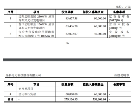 晶科科技發(fā)行募集資金總額為25.98億元,募集資金凈額為24.17億元。晶科科技最終募集資金凈額比原計(jì)劃少8324.30萬元。2020年4月25日,晶科科技披露的招股說明書顯示,公司擬募集資金25.00億元,分別用于遼陽忠旺集團(tuán)230MW屋頂分布式光伏發(fā)電項(xiàng)目、營口忠旺鋁業(yè)156MW屋頂分布式光伏發(fā)電項(xiàng)目、寶應(yīng)光伏發(fā)電應(yīng)用領(lǐng)跑者2017年柳堡2號100MW漁光互補(bǔ)項(xiàng)目、償還銀行貸款。