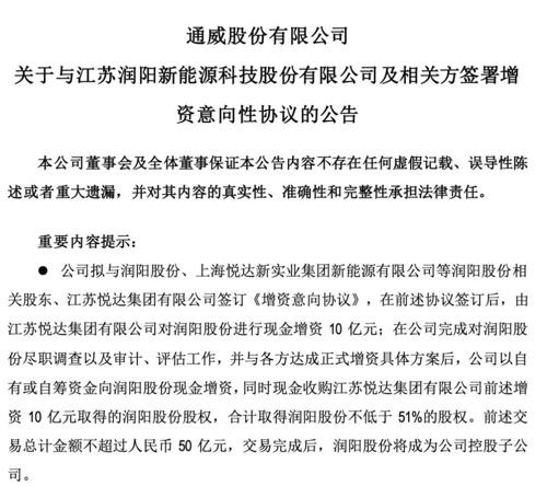 通威股份擬斥資不超過(guò)50億元,合計(jì)取得潤(rùn)陽(yáng)股份不低于51%的股權(quán)