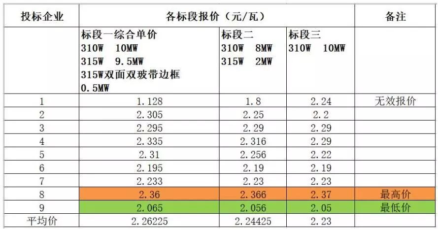 從開標(biāo)價(jià)格可以看出,除去無(wú)效報(bào)價(jià),三個(gè)標(biāo)段的最低價(jià)格為2.05元/瓦,最高報(bào)價(jià)為2.37元/瓦,平均價(jià)格集中在2.2-2.3元/瓦。