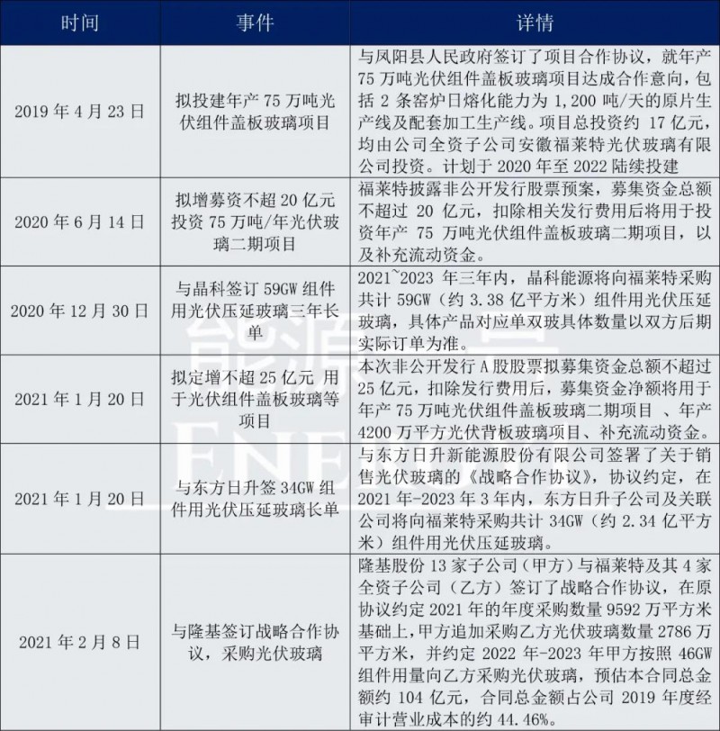 去年12月,它與晶科能源簽訂了59GW的組件用光伏壓延玻璃三年長(zhǎng)單;今年1月和2月,福萊特再度分別與東方日升、隆基股份再簽大額長(zhǎng)單,預(yù)計(jì)總計(jì)規(guī)模在200多億到300億左右。