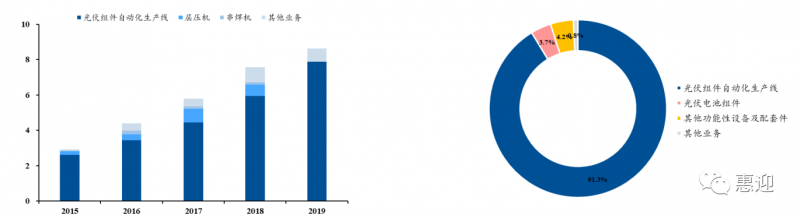 多主柵串焊機逐步成為公司光伏設(shè)備中的主要構(gòu)成產(chǎn)品。2018 年,公司多主柵串焊機開始放量,在公司光伏設(shè)備收入中占比約為 5.88%,2019 年,公司多主柵串焊機收入從 0.2 億元提升至 2.52 億元,占光伏設(shè)備收入中的 40.91%,超越常規(guī)串焊機,成為公司光伏設(shè)備業(yè)務(wù)中占比最高的業(yè)務(wù),成為公司的營業(yè)收入中占比最高的業(yè)務(wù)。未來,公司的串焊機有望深度受益于光伏組件技術(shù)迭代,在新一輪市場擴展中占據(jù)優(yōu)勢地位。