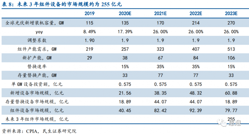 經(jīng)民生證券測算,預(yù)計 2021 年、2022 年、2023 年組件設(shè)備的市場規(guī)??煞謩e達(dá)到 82.42 億元、92.39 億元和 79.77 億元,未來 3 年組件設(shè)備的市場規(guī)模合計可達(dá) 255 億元,組件設(shè)備廠商擁有廣闊的發(fā)展前景。