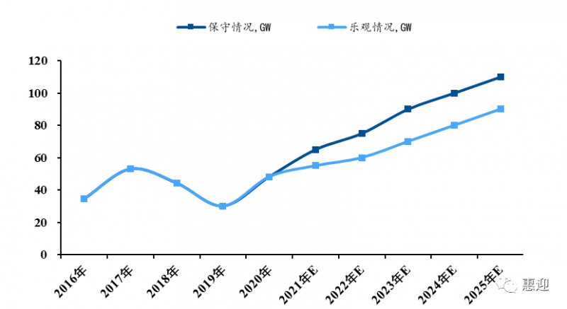 光伏行業(yè)降本提效穩(wěn)步推進(jìn),疊加全球各國可再生能源政策的頒布與執(zhí)行,預(yù)計全球光伏累計裝機容量將繼續(xù)保持增長態(tài)勢,根據(jù) CPIA 的預(yù)測,“十四五”期間,樂觀預(yù)期下,全球光伏裝機規(guī)模年均新增 287GW,中性情況下年均新增 222GW。該預(yù)期與 IRENA 于 2019 年年在分析報告《光伏的未來》給出的預(yù)測基本一致,IRENA 認(rèn)為,到 2030 年光伏的裝機目標(biāo)將達(dá)到 8500GW,年均光伏新增規(guī)模將超過 250GW。