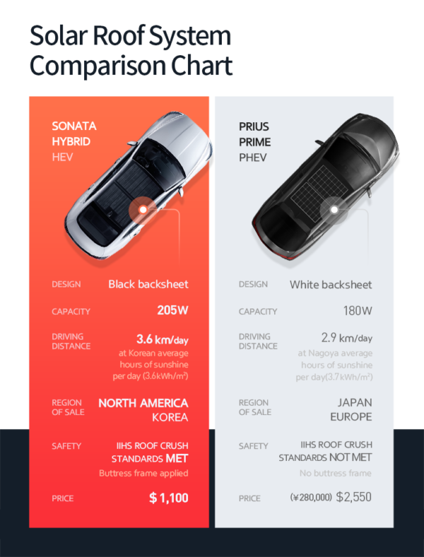現(xiàn)代公司表示,其太陽(yáng)能電池陣列系統(tǒng)與競(jìng)爭(zhēng)對(duì)手的汽車(chē)相比具有高效的設(shè)計(jì)優(yōu)勢(shì),如配備太陽(yáng)能車(chē)頂?shù)呢S田普銳斯。普銳斯有一個(gè)單獨(dú)的太陽(yáng)能電池,需要兩個(gè)階段的轉(zhuǎn)換來(lái)為高壓驅(qū)動(dòng)電池和輔助“啟動(dòng)”電池充電。索納塔只進(jìn)行一次轉(zhuǎn)換,直接通過(guò)電池板向最大功率點(diǎn)跟蹤器充電控制器輸送電力,并直接進(jìn)入輔助電池和驅(qū)動(dòng)電池。