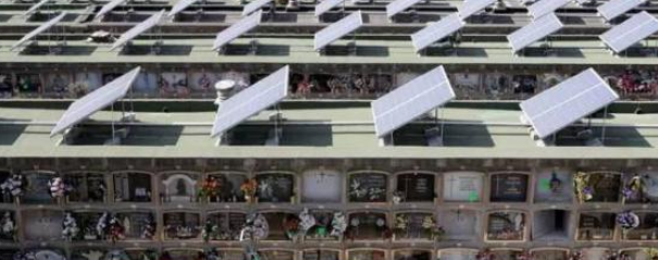 2008年,西班牙巴塞羅那附近小鎮(zhèn)桑塔克羅瑪將大量太陽能電池板安放到了一個“極少有人打攪的地方”——墓地。這個墓地的特別之處在于,462塊整齊劃一的太陽能電池板出現(xiàn)在墓地內(nèi)部,棺材一層層碼放起來,其中最高的“棺材樓”竟達到了五層,太陽能電池板就放在最高一層棺材上面。這些太陽能電池板生產(chǎn)的電能足夠滿足60戶居民的年需求,能讓該鎮(zhèn)一年減少向大氣中排放大約62噸二氧化碳。
