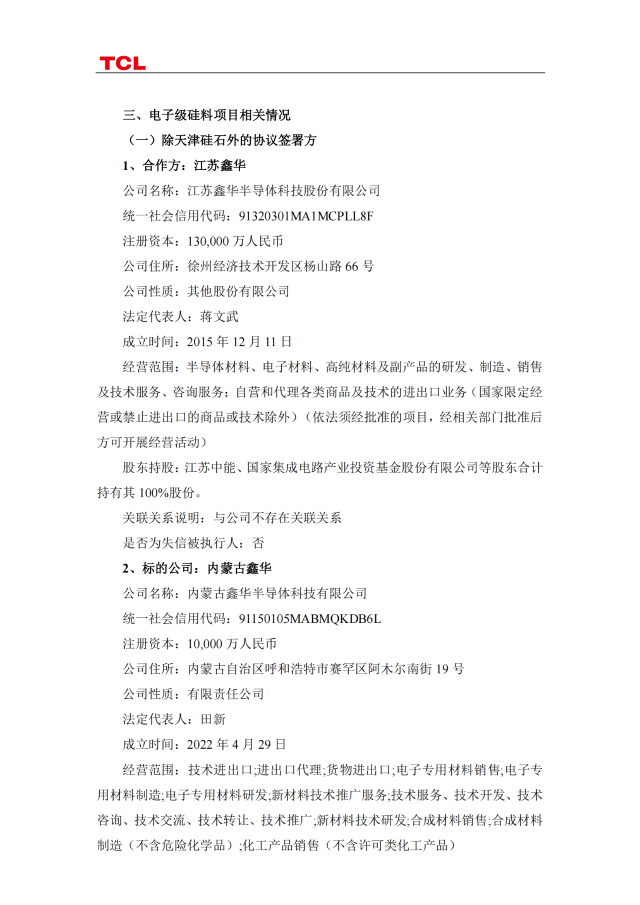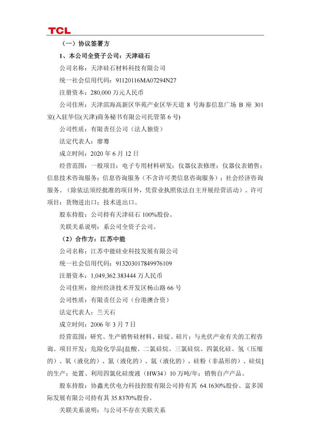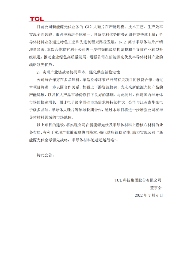 7月7日,TCL科技發(fā)布公告稱,今年4月與協(xié)鑫集團(tuán)有限公司及關(guān)聯(lián)方簽訂《合作框架協(xié)議書》,就投資新建光伏級(jí)和電子級(jí)硅料項(xiàng)目開展合作。