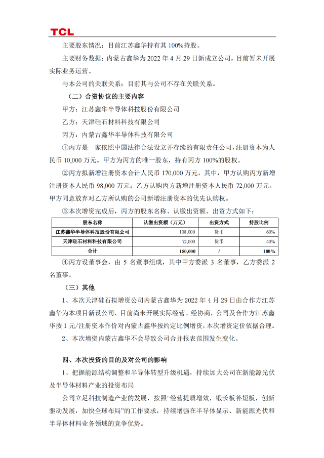 TCL科技表示,本次合作可以把握能源結(jié)構(gòu)調(diào)整和半導(dǎo)體轉(zhuǎn)型升級(jí)機(jī)遇,持續(xù)加大公司在新能源光伏及半導(dǎo)體材料產(chǎn)業(yè)的投資布局公司立足科技制造產(chǎn)業(yè)的發(fā)展,按照“經(jīng)營提質(zhì)增效,鍛長板補(bǔ)短板,創(chuàng)新驅(qū)動(dòng)發(fā)展,加快全球布局”的工作要求,持續(xù)增強(qiáng)在半導(dǎo)體顯示、新能源光伏和半導(dǎo)體材料業(yè)務(wù)領(lǐng)域的競(jìng)爭優(yōu)勢(shì)。
