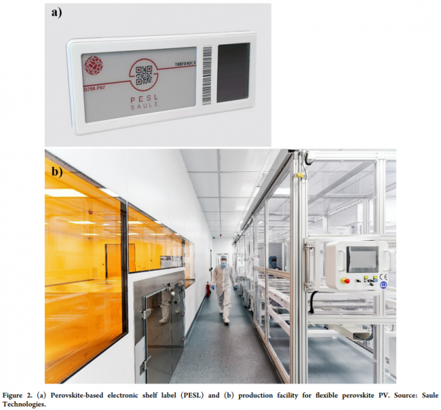 市場規(guī)模和增長當(dāng)然不是唯一需要考慮的重要方面。從制造商的角度來看,開發(fā)定制量最少的產(chǎn)品很重要,因?yàn)檫@會(huì)帶來額外的風(fēng)險(xiǎn)和成本。此外,如何將額外的功率預(yù)算貨幣化是非常重要的。考慮到所有這些,電子貨架標(biāo)簽似乎是最有吸引力的選擇之一。Saule 開發(fā)的基于鈣鈦礦的電子貨架標(biāo)簽 (PESL) 的示例和用于制造柔性鈣鈦礦 PV 的試點(diǎn)生產(chǎn)設(shè)施如圖 2 所示。