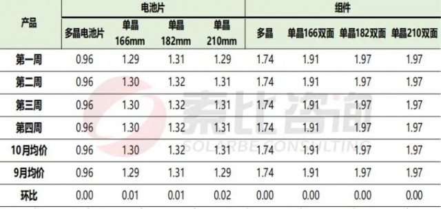 根據(jù)索比咨詢對(duì)多家組件制造商的調(diào)研:就10月組件價(jià)格行情來(lái)看,單晶166雙面均價(jià)1.91元/W,較9月環(huán)比持平;單晶182雙面均價(jià)1.97元/W,較9月環(huán)比持平;單晶210雙面均價(jià)1.97元/W,較9月環(huán)比持平。