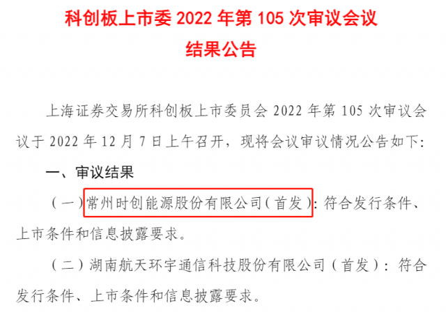 12月7日,上海證券交易所科創(chuàng)板上市委員會(huì)發(fā)布公告稱,常州時(shí)創(chuàng)能源股份有限公司首次公開(kāi)發(fā)行股票申請(qǐng)符合發(fā)行條件、上市條件和信息披露要求。