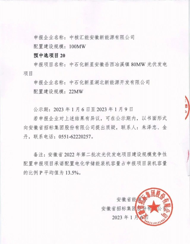 1月6日,安徽省能源局公示了2022年第二批光伏、風(fēng)電項目競爭性配置優(yōu)選結(jié)果,共計37個項目入選,其中光伏規(guī)模為1.5GW,項目20個;風(fēng)電項目規(guī)模為1.5GW,項目17個。