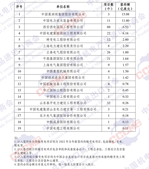 2022年中國企業(yè)境外輸變電項(xiàng)目簽約額排名