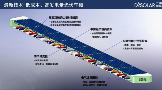 在第六屆分布式能源嘉年華上,一道新能源系統(tǒng)工程創(chuàng)新研究院院長韓利生分享了零碳服務(wù)區(qū)的光儲充一體化停車場解決方案。他表示一道新能推出的停車區(qū)光伏解決方案,以高效、美觀、便捷為理念,對于常規(guī)停車棚造價高、發(fā)電量低、設(shè)計感缺失等缺點(diǎn)進(jìn)行了針對性優(yōu)化。首先,采用中跨距柔性高支架代替常規(guī)短跨距鋼架式結(jié)構(gòu),降低了造價,同時為N型雙面鋼邊框組件提供最佳傾角,確保整面發(fā)電量最優(yōu);其次,布置白色張拉膜作為防曬防雨材料,并利用其反光特性,增加雙面組件的背面發(fā)電量;最后,采用防風(fēng)導(dǎo)流板、安全隔離護(hù)板等結(jié)構(gòu),將光伏組件迎風(fēng)面和地面電氣設(shè)備保護(hù)起來,既提高了安全性、又增加了美觀性。