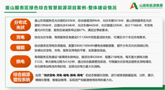 舉例來說,崮山服務(wù)案區(qū)綠色綜合智慧能源項目位于濟(jì)南長清區(qū)京臺高速段,占地約260 畝,其中,東側(cè)服務(wù)區(qū)較為狹長,西側(cè)服務(wù)區(qū)背靠崮 云湖,周邊旅游資源豐富,西側(cè)服務(wù)區(qū)內(nèi)已建成酒店和觀光廊道。崮山服務(wù)區(qū)年用電量約300萬度,折合年碳排放量約2653噸,服務(wù)區(qū)當(dāng)前變壓器總?cè)萘繛?500kVA。崮山服務(wù)區(qū)已建成充電樁共8個、污水處理設(shè)施、多聯(lián)機(jī)中央空調(diào)系統(tǒng)等,本次建設(shè)內(nèi)容包括分布式光伏、 儲能、充電站、換電站、綜合能源管理系統(tǒng)等。實現(xiàn)“光伏發(fā)電-充電-儲電-換電-用電”的動態(tài)智能化控制,進(jìn)行碳排放數(shù)據(jù)監(jiān)視、分析、展示、精細(xì)化管理、智能運(yùn)維等,實現(xiàn)資產(chǎn)和能源使用效率的最大化。
