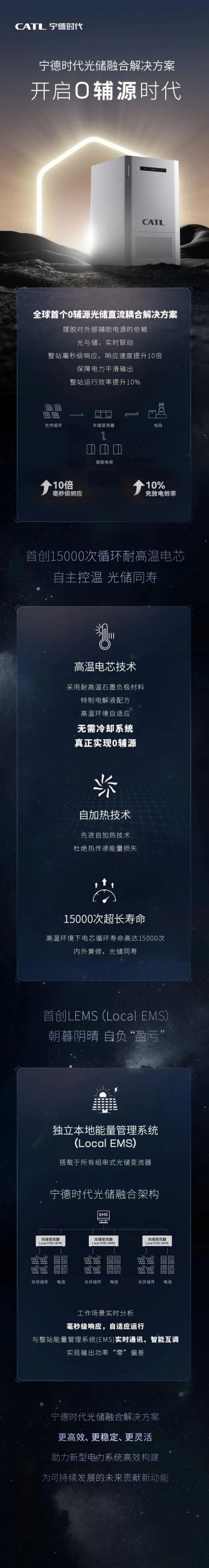 寧德時(shí)代發(fā)布了光儲(chǔ)融合解決方案,這是全球首個(gè)0輔源光儲(chǔ)直流耦合解決方案,可擺脫對(duì)外部輔助電源的依賴,光與儲(chǔ),實(shí)時(shí)聯(lián)動(dòng)整站毫秒級(jí)響應(yīng),響應(yīng)速度提升10倍,保障電力平滑輸出,整站運(yùn)行效率提升10%。