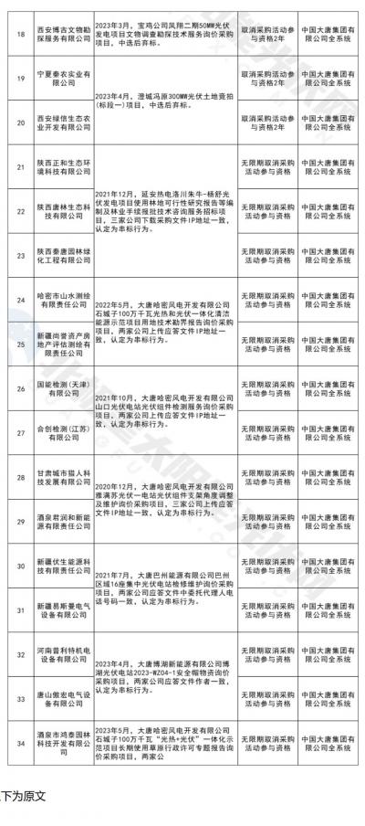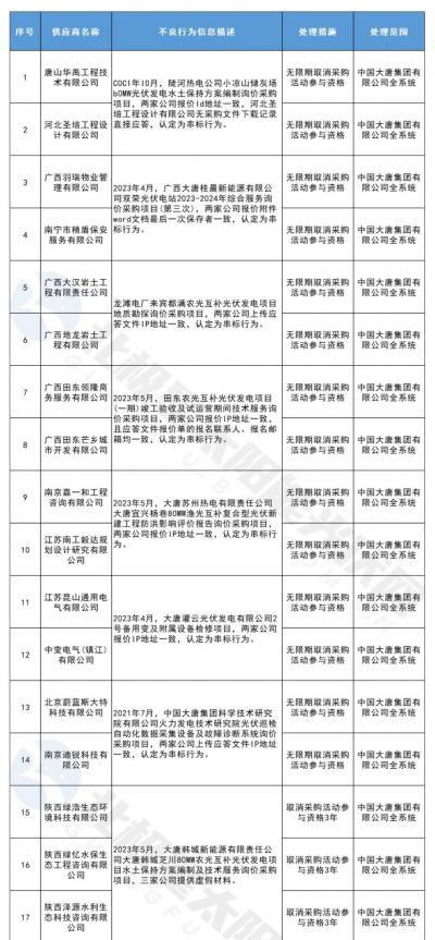 7月7日,大唐集團發(fā)布關(guān)于供應(yīng)商不良行為處理情況的公告(2023年第8批),對出現(xiàn)弄虛作假、串標等行為的供應(yīng)商進行了處理。