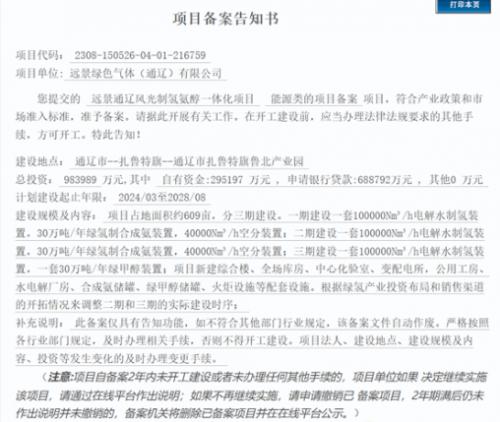據(jù)悉,該項目位于通遼市扎魯特旗通遼市扎魯特旗魯北產(chǎn)業(yè)園,由遠景綠色氣體(通遼)有限公司實施,項目總投資98.4億元,計劃建設(shè)起止年限:2024/03至2028/08。