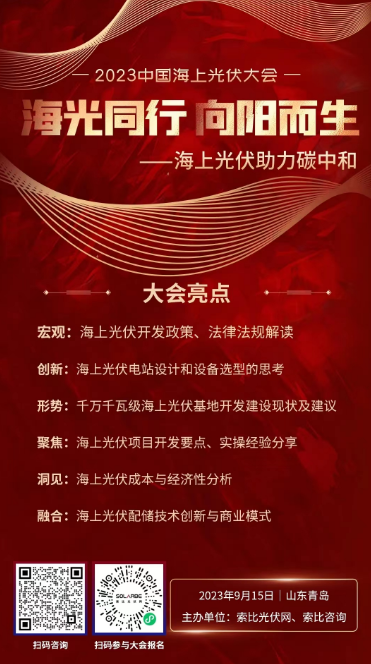 2023年9月15日,索比光伏網(wǎng)以“海光同行,向陽(yáng)而生——海上光伏助力碳中和”為主題,計(jì)劃在山東青島舉辦“2023中國(guó)海上光伏大會(huì)”,為協(xié)力打造技術(shù)先進(jìn)、生態(tài)友好、智慧融合的“環(huán)渤海、沿黃?!彪p千萬(wàn)千瓦級(jí)海上光伏基地貢獻(xiàn)力量。