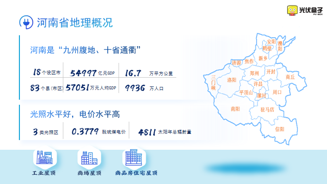 河南是“九州腹地,十省通衢”,有83個縣,9936萬人口,戶用發(fā)展基礎(chǔ)好。加上電價水平較高,光照水平較好,極適合發(fā)展大批量的戶用光伏電站。