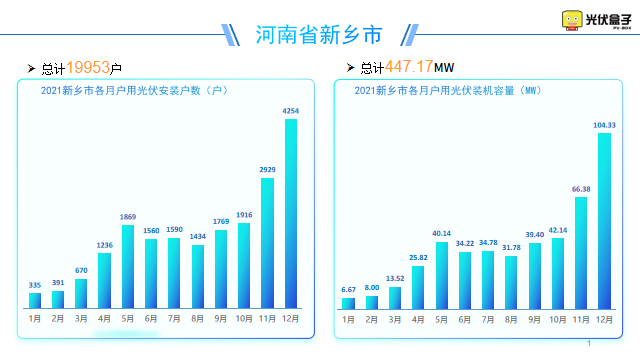 新鄉(xiāng)市是河南省戶用光伏安裝戶數(shù)最高的城市,也是戶用光伏裝機容量最高的城市,2021年全年安裝了2萬戶,447.17MW。