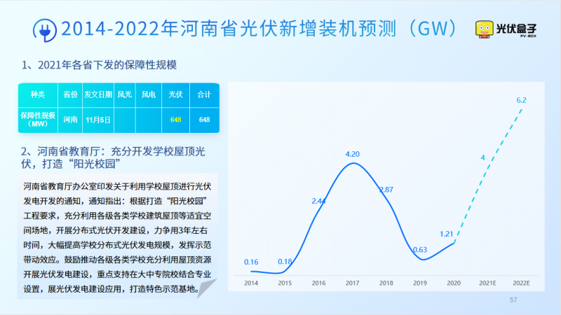 2021年11月5日河南省下發(fā)光伏保障性建設(shè)規(guī)模指標(biāo)共648MW。同時,河南省教育廳提出打造“陽光校園”工程,要求充分利用各級各類學(xué)校建筑屋頂?shù)冗m宜空間場地,開展分布式光伏開發(fā)建設(shè),力爭用3年左右時間,大幅提高學(xué)校分布式光伏發(fā)電規(guī)模。鼓勵推動各級各類學(xué)校充分利用屋頂資源開展光伏發(fā)電建設(shè),打造特色示范基地。