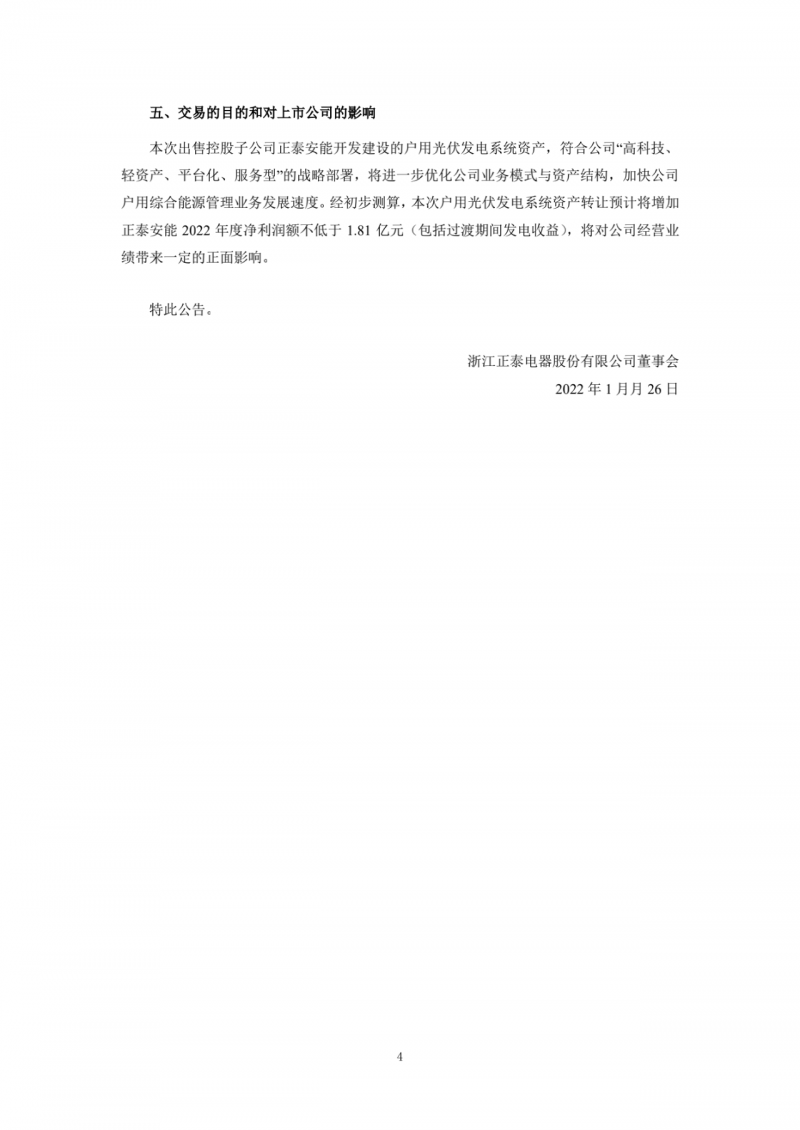 正泰電器認(rèn)為,本次出售控股子公司正泰安能開發(fā)建設(shè)的戶用光伏發(fā)電系統(tǒng)資產(chǎn),符合公司“高科技、輕資產(chǎn)、平臺化、服務(wù)型”的戰(zhàn)略部署,將進(jìn)一步優(yōu)化公司業(yè)務(wù)模式與資產(chǎn)結(jié)構(gòu),加快公司戶用綜合能源管理業(yè)務(wù)發(fā)展速度。經(jīng)初步測算,本次戶用光伏發(fā)電系統(tǒng)資產(chǎn)轉(zhuǎn)讓預(yù)計將增加正泰安能2022年度凈利潤額不低于1.81億元(包括過渡期間發(fā)電收益),將對公司經(jīng)營業(yè)績帶來一定的正面影響。