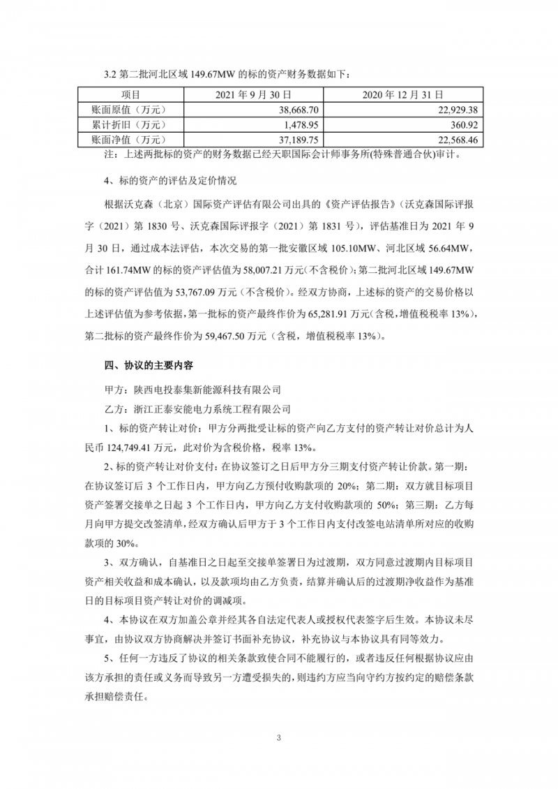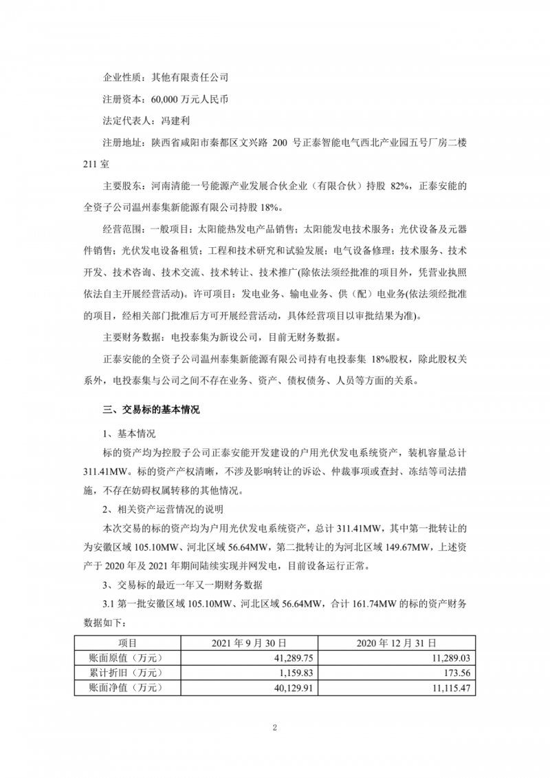 根據(jù)交易公告,正泰安能與電投泰集簽訂資產(chǎn)收購協(xié)議,將其所持有的河北及安徽區(qū)域總計311.41MW戶用光伏發(fā)電系統(tǒng)資產(chǎn)分兩批轉(zhuǎn)讓給電投泰集,交易對價總計為124749.41萬元(均為含稅價,增值稅稅率13%);其中第一批轉(zhuǎn)讓安徽區(qū)域 105.10MW、河北區(qū)域56.64MW,合計161.74MW,交易對價為65281.91萬元(含稅價,增值稅稅率13%);第二批轉(zhuǎn)讓河北區(qū)域149.67MW,交易對價為59467.50萬元(含稅價,增值稅稅率13%)。上述資產(chǎn)交割完成后,正泰安能或其子公司將繼續(xù)為上述戶用光伏發(fā)電系統(tǒng)提供運(yùn)維服務(wù)。