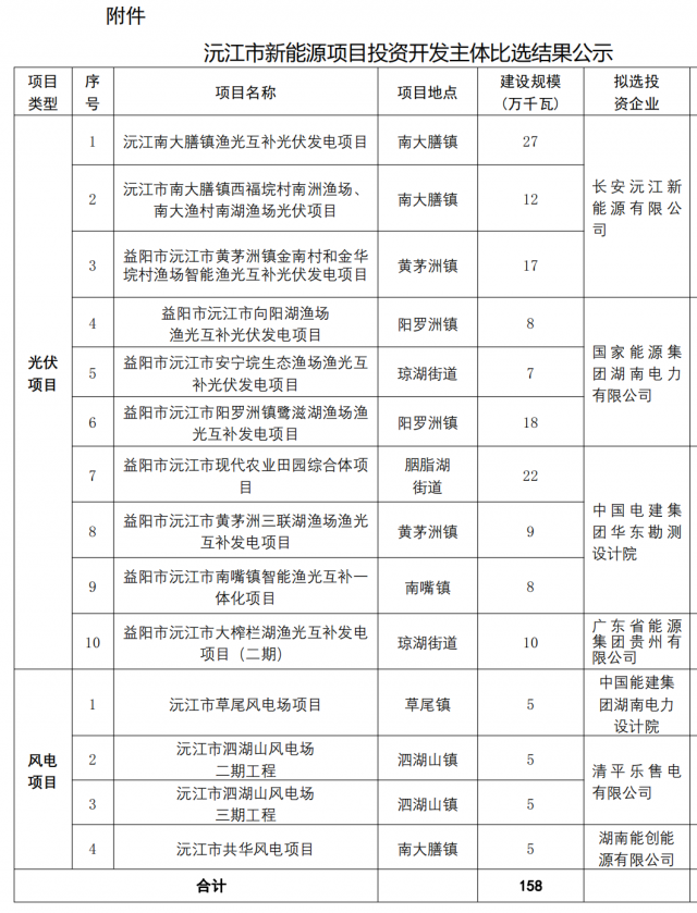 2月17日,湖南省沅江市人民政府下發(fā)《沅江市新能源項目投資開發(fā)主體比選結(jié)果公示》,共下發(fā)了1.58GW,包含1.38GW光伏項目、0.2GW風(fēng)電項目。