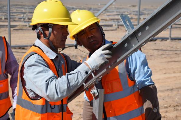 在樁基施工過程中,克服作業(yè)面環(huán)境惡劣、氣溫高紫外線強、常伴有沙塵暴等因素,以每日、每周為節(jié)點嚴格落實施工部署,優(yōu)化工序施工方案,采取測量放點精準定位,樁位中心清晰標識,樁機安裝水平尺,專人盯控預埋件,有效避免樁位、樁身垂直度、樁長、樁頂標高、預埋件定位等工序風險點出現,5月27日優(yōu)質完成樁基混凝土澆筑,為項目安全快速推進奠定了堅實的基礎。8月12日,玉門40萬千瓦光伏發(fā)電工程項目首批次光伏板順利安裝,項目正式進入電氣安裝階段,同時開啟了建設目標“加速度”。10月30日項目提前40天順利完工。